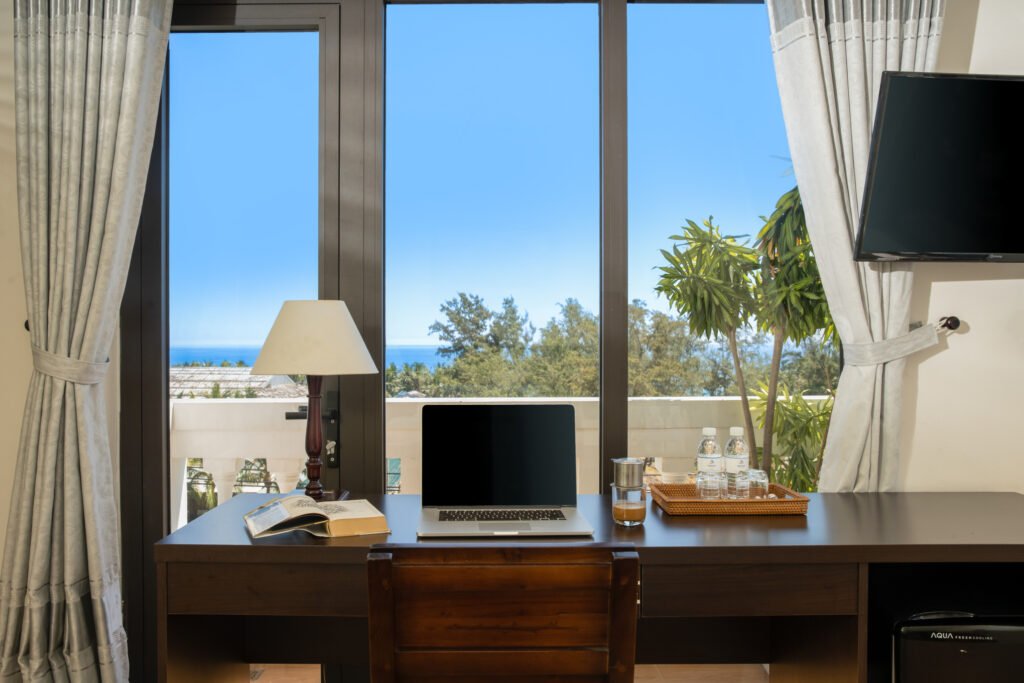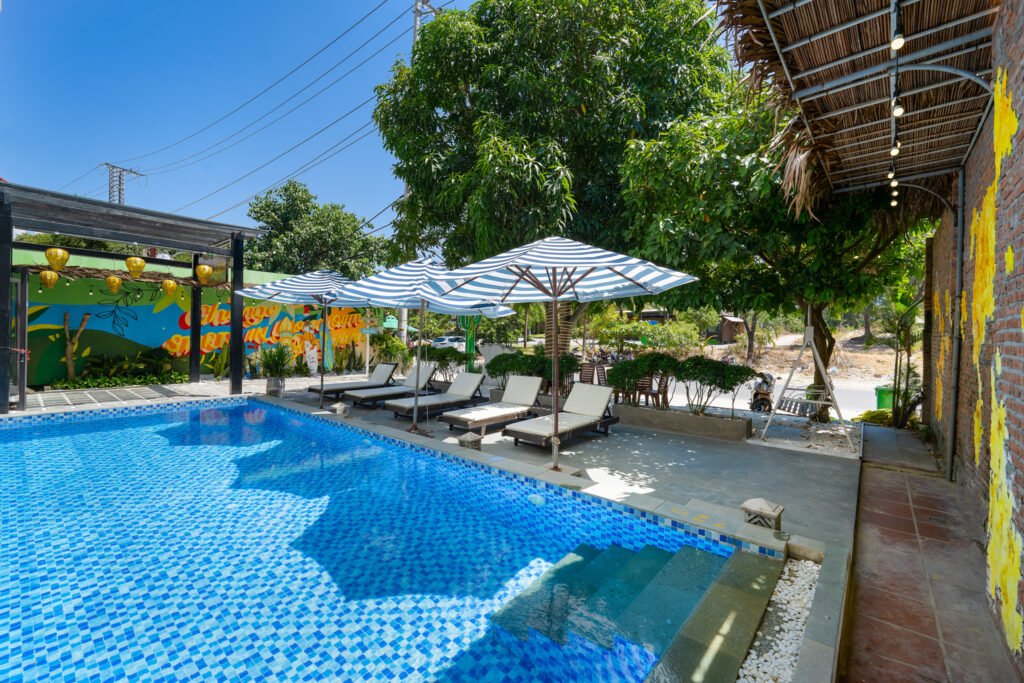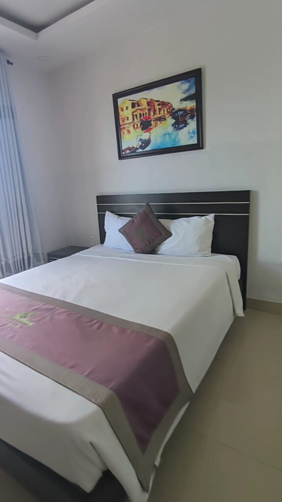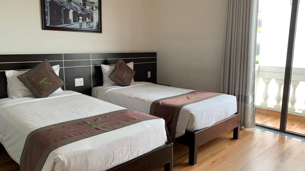 Sits at Cua Dai Beach, about 200 meters from the water – close enough to walk over in flip flops, far enough that ‘Beachfront’ is doing some heavy lifting on the name. The price point is what keeps people coming back, and the rooms are clean, the pool is maintained, and free coffee, tea, and water in the lobby is a genuinely useful perk for early risers.