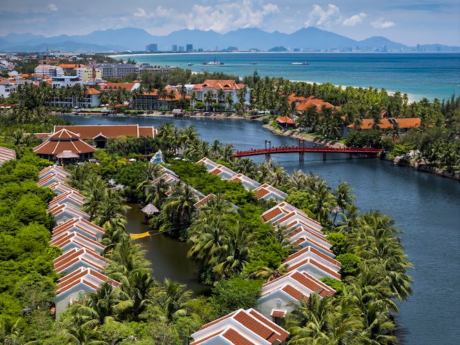 KOI sits on a small private island connected by a footbridge, which sounds fancier than it is, but does give the place a calm, removed feeling that’s hard to find this close to Hoi An. The setting – river on one side, easy beach access on the other – is the main draw here. Flowers everywhere, clean rooms with Vietnamese styling, and a pool area that works well when the service actually shows up.