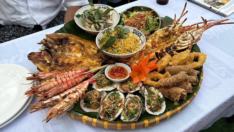 Go for the fish hotpot (lẩu cá) and the seafood salad as your anchors, then add one lobster baked with cheese to share - that combination covers the full range of what the kitchen actually does well.