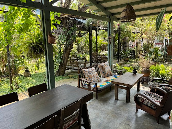 A garden cafe sitting right on a busy road that somehow manages to feel quiet once you’re inside. The greenery is thick enough that street noise becomes background, fans keep things cool, and there are plenty of spots to settle in for longer than you planned.