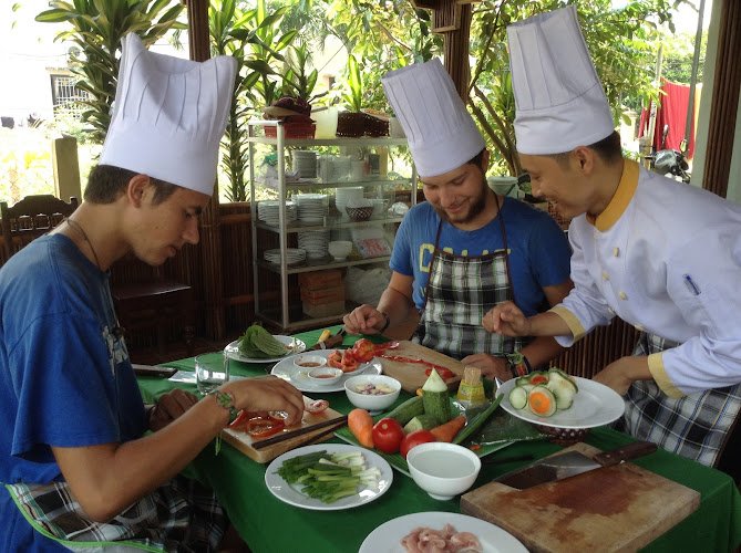 The food comes out of the garden directly into your meal, and the herb-based cocktail at 25,000 VND is the kind of thing you’ll kick yourself for not ordering two of. Prices are low enough that eating here even without the class makes sense during a bike ride through the village.